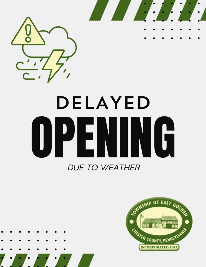 Due to the inclement weather, Township administrative offices will be opening at 10:00 am on Tuesday, March 3, 2026. Thank you and stay safe!