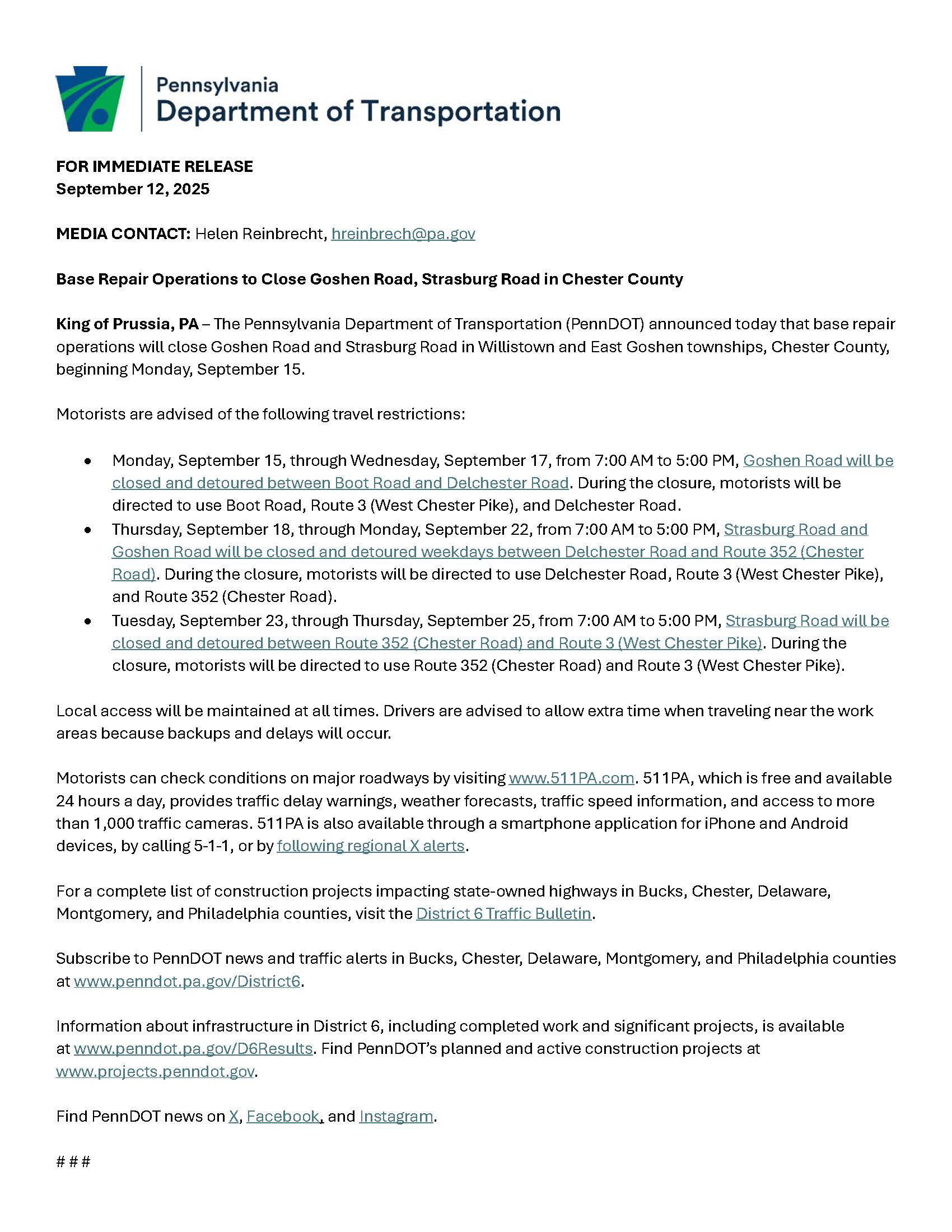 PennDot Goshen Rd & Strasburg Rd Closures 9-15-25
