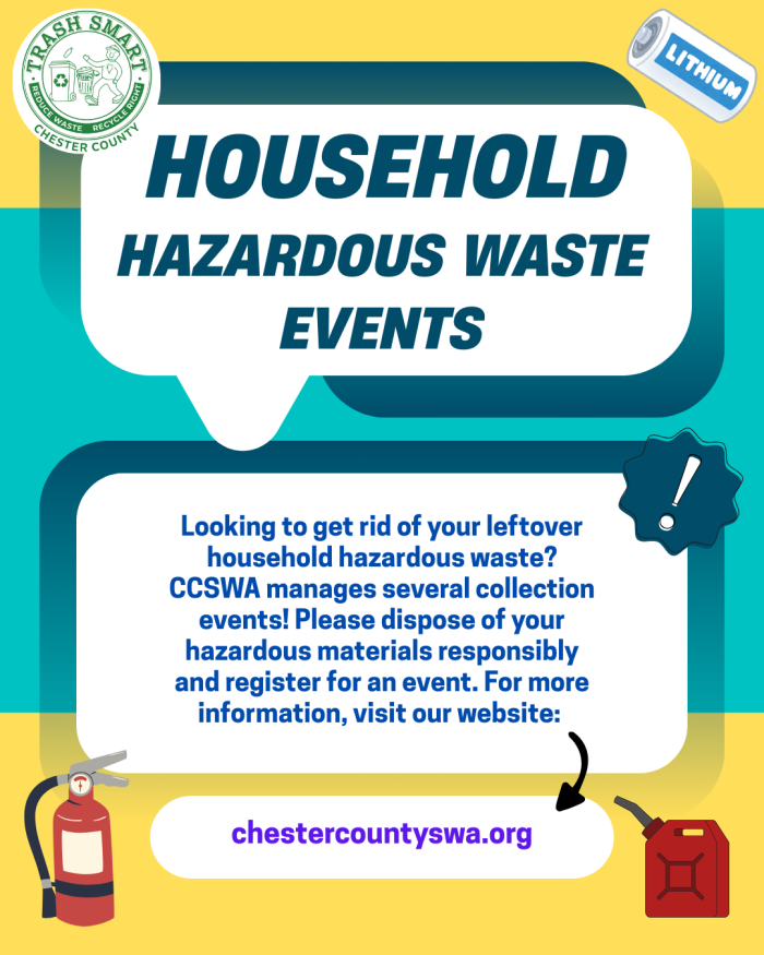 Visit the Chester County Solid Waste Authority Household Hazardous Waste Page for more information.